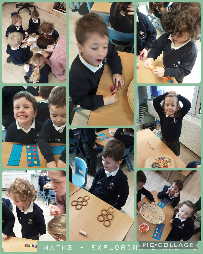 In Maths, the FS children have been exploring the numbers 9 and 10. Using a range of practical resources such as counters, cubes and ten frames, the children have been learning how these numbers can be made in different ways.